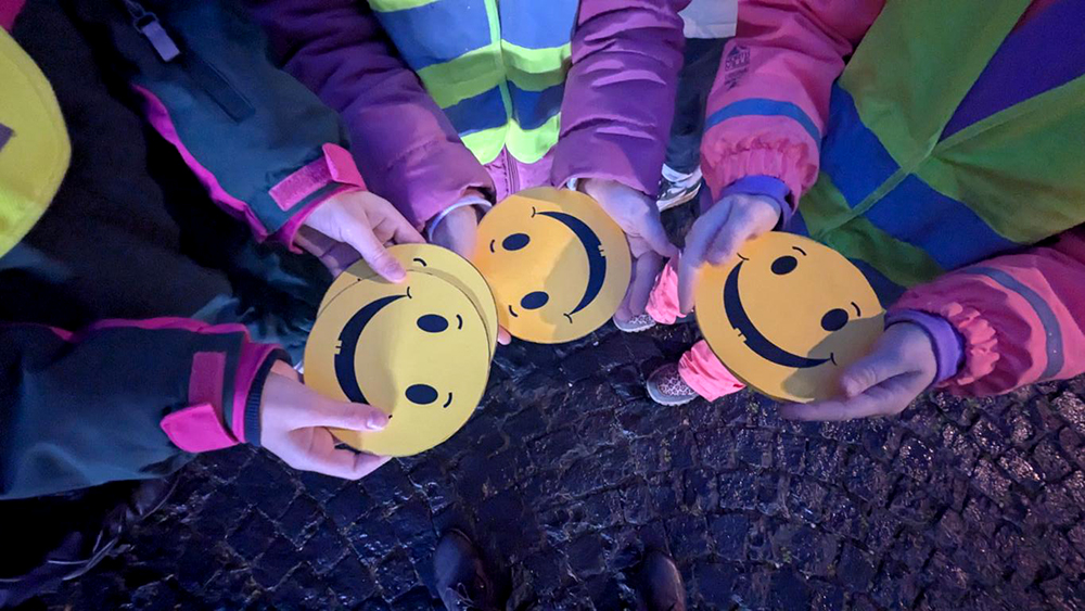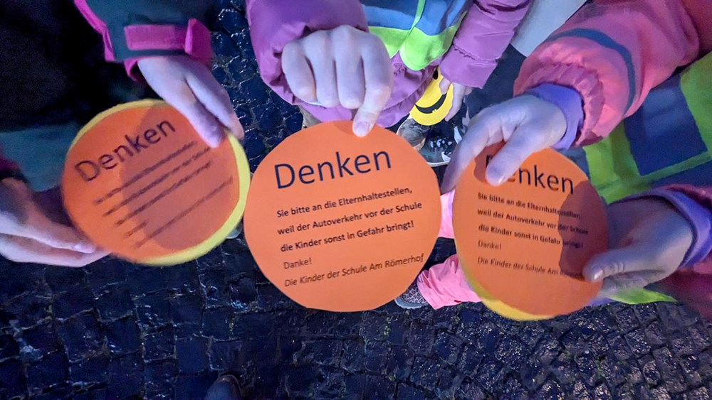 Sie verteilten Danke-Zettel an Erwachsene, die ihre Kinder zum Beispiel mit dem Fahrrad, Lastenrad oder zu Fuß zur Schule begleiten. Auch Eltern, die die vorgeschlagenen Elternhaltestellen im Schulumfeld benutzten, konnten sich über einen lächelnden Smiley freuen und wurden noch zusätzlich mit netten Worten bedacht.